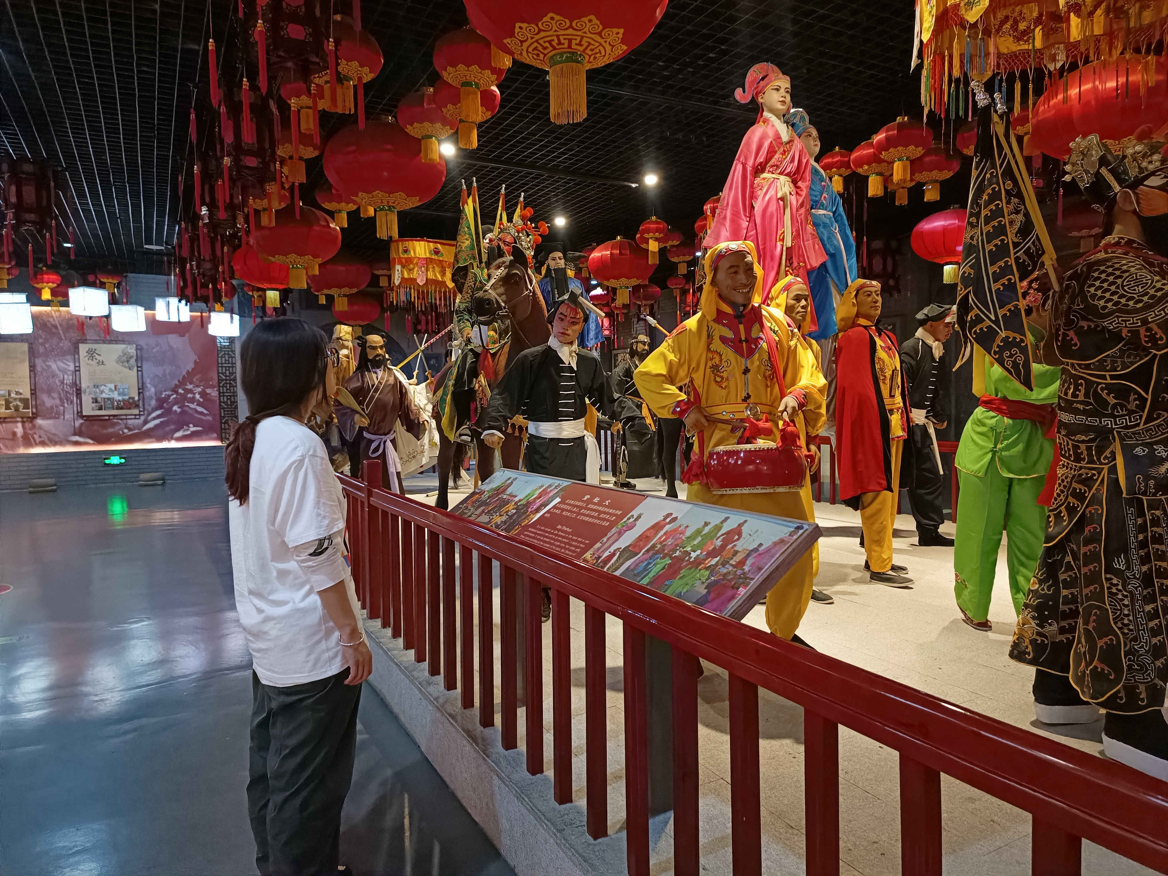 在社火文化展区,团队成员们的兴趣尤为浓厚。这里陈列的社火服饰、道具等实物,以及详细的图文介绍,系统展现了宝鸡社火的发展脉络与独特风貌。当看到社火游演场景复原的泥塑作品时,同学们纷纷驻足,仿佛置身于热闹非凡的社火现场。“这些展品让抽象的民俗文化变得具象可感,让我们真切体会到社火背后深厚的文化底蕴。”一位同学在参观时说道。