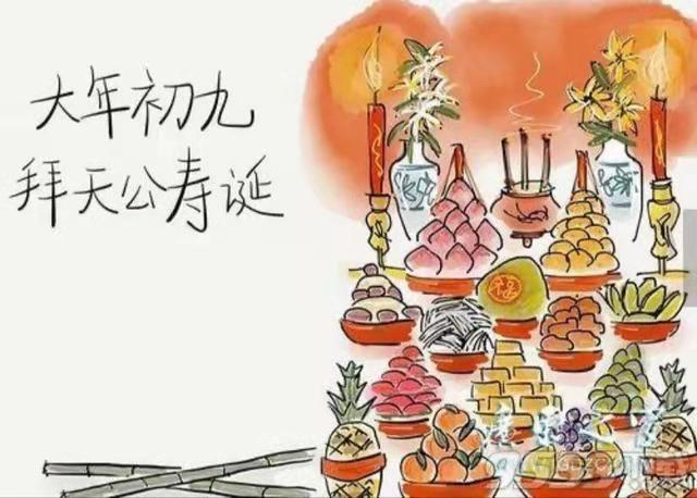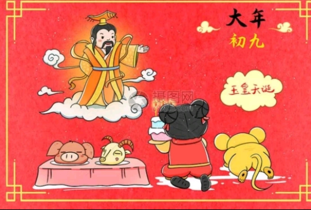 正月初九是天公玉皇大帝诞辰之日,要虔誠祭祀天公。玉皇大帝是统御天地人"三界"诸神及人间万灵的至高无上的天神,是"天"的代表,民间呼之为"老天爷"。由于是众神之王,一般是身穿九章法服,头戴十二行珠冠冕旒,一副帝王派头。在"上九日"祭祀,焚香叩拜,燃放鞭炮、庄重热鬧。