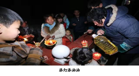 灯象征光明,象征美好。添灯寓意,一是添仓、添财、添福、添寿;一是添丁,人丁兴旺。是人们祈福,向往美好的举动。灯是用萝卜做成,将萝卜切二寸长节,一半掏空,靠底部插根棍子,在掏空处放棉花捻子,倒上油点着。夜幕降临,孩子们点着灯,到当年娶媳妇的家,或到无男孩的家转游,家长必然很欢迎,主妇会立即提食用油壶给孩子们灯里添油。也有要求女孩去添灯,寓意“接引”。灯盏队到谁家,谁家的家庭主妇拿此灯到处照照,边照边说:照照柜,新郎新娘一头睡;照照桌,孩子生上一大窩;照照门,孩子生上一大群;照照床,明年小孩会叫娘;……。这是孩子端着萝卜灯,主妇哼的顺口溜。孩子的灯盏队无论到谁家都很高兴,把自家的油往灯盏里添,祈聁早添子孙。特别是新娶媳妇的家最喜欢添灯孩子的到来。灯盏队欢欢喜喜走街穿巷,犹如小龙,很是壮观。晚上灯盏队的孩子们玩夠了,举灯回家,再把家里照一遍,祈祷家庭幸福,一年好运来。然后放在家院子里或门口,让其自然熄灭。