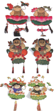 一对一般通高2l厘米,其一为男童,头戴秀才帽,双手各举一束海棠花,盘腿坐于金瓜之上,金瓜处有一半圆形罐体:其一为女童,头扎双髻,双手亦高举一束海棠花,坐于盛开的莲花之上,莲花处也是一个半圆形罐体,前者是“金瓜贵子”,后者“莲生贵子”图案,手中高举海棠花,是取“满堂富贵”之意。新婚挂在堂上,里面插着石榴花,寓“多福、多寿、多孙”之意。