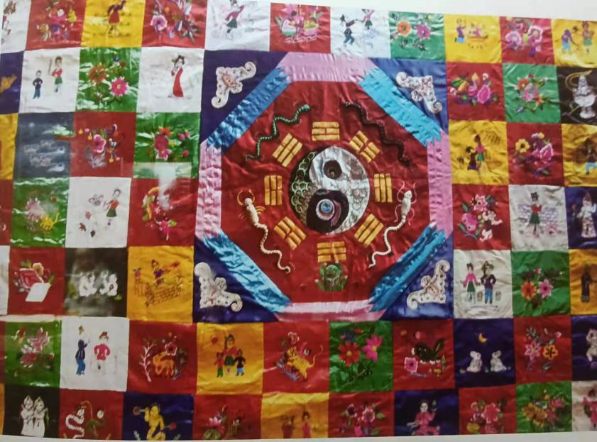其中“百花帐”是由一百块不同的布料,一百个不同姓氏的妇女绣成的,最后拼接在一起的祭祀绣品。上面绣着象征吉祥图案八卦、蝙蝠、莲花、松鹤、鹿雁、丹凤朝阳、吹箫引凤、故事人物等。多悬挂于寺庙、宫观以祈求神灵保护。除此还有“莲座”“长幡”及“供桌围裙”祭祀绣品。