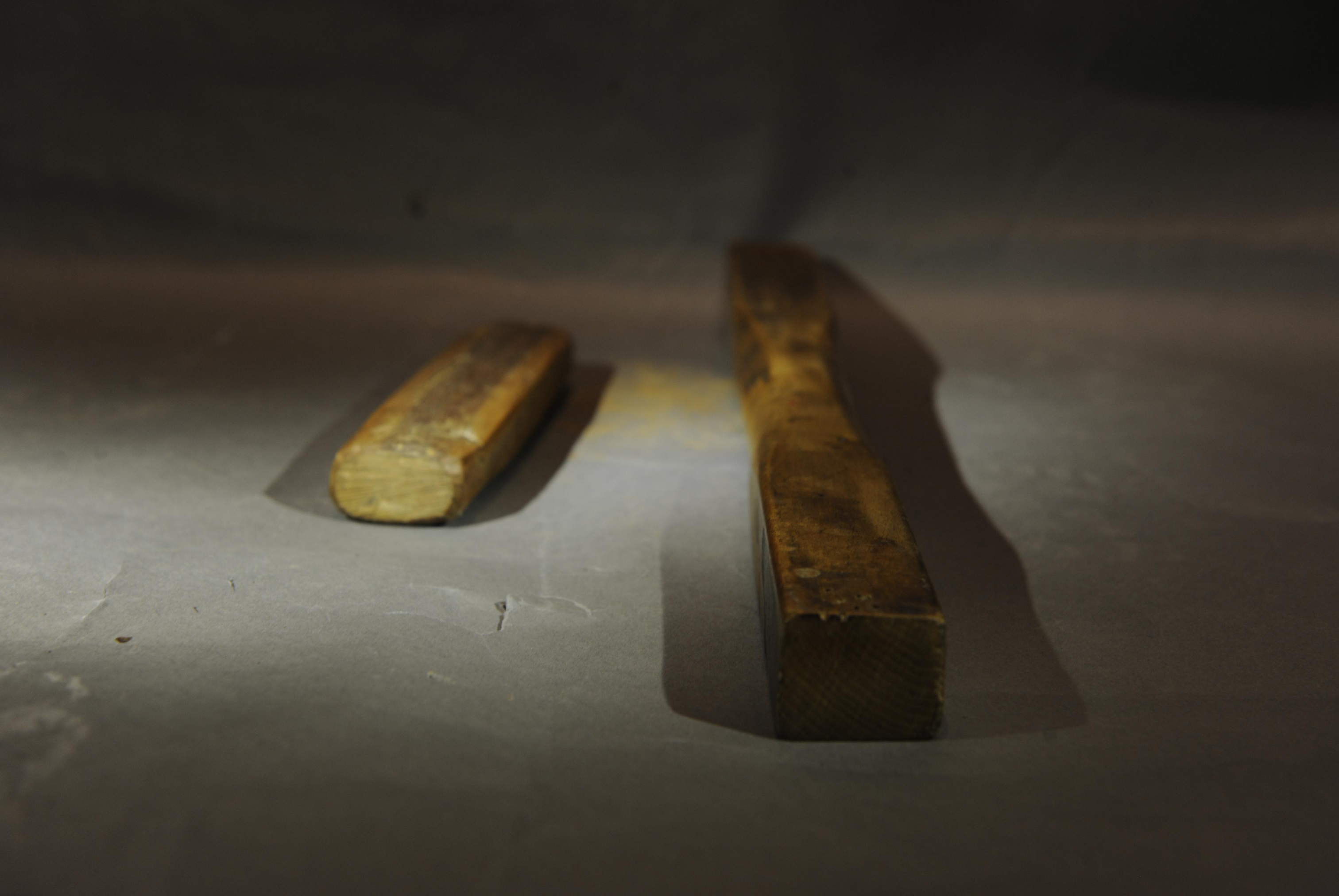 敲击乐器,由两根长短不一的长方形木棒组成,相互敲击发声,短木板长16.5厘米,宽3.5厘米,高2厘米。
