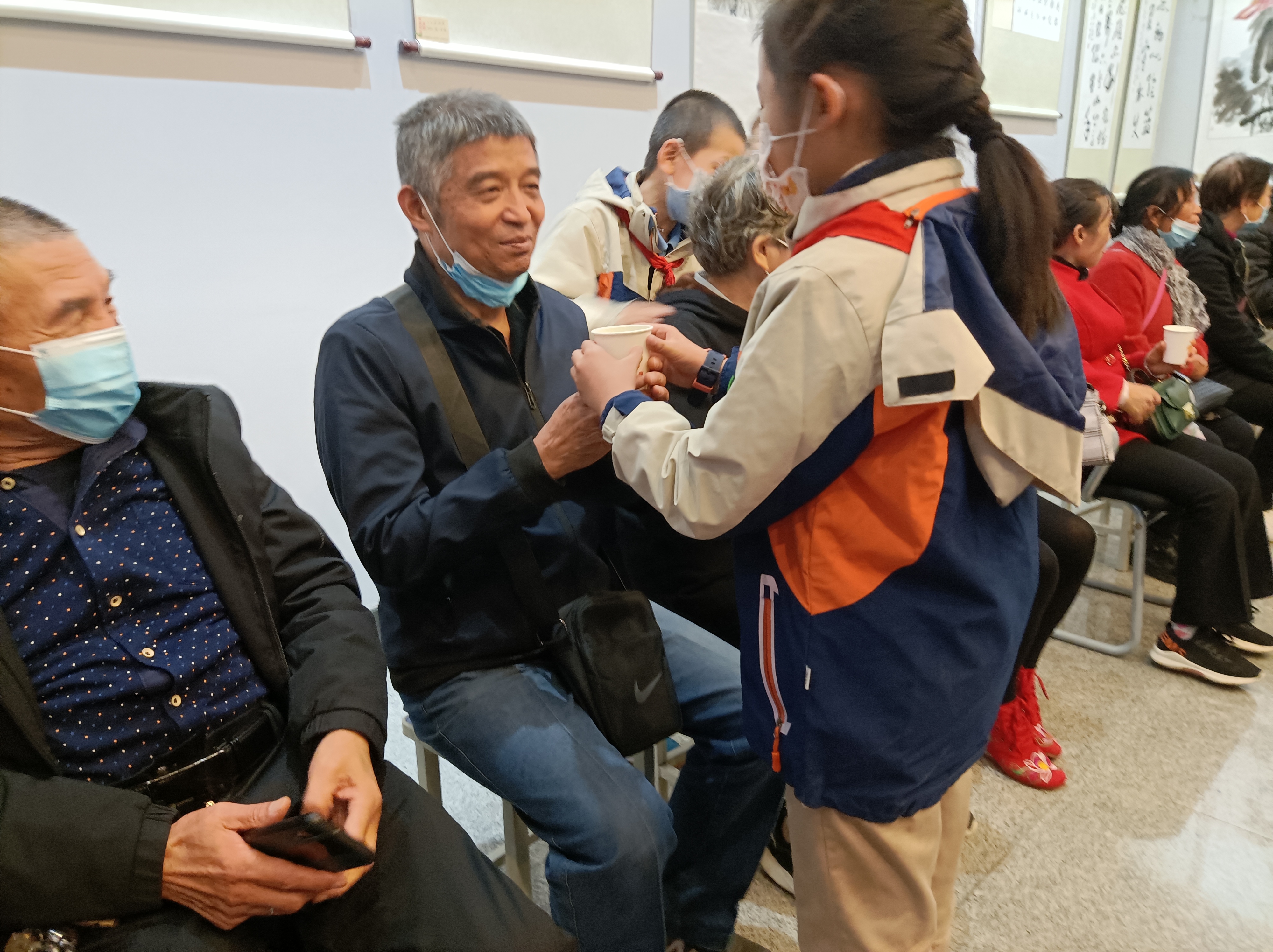 之后,同学们和自己的爷爷奶奶们来到我馆的重阳节活动现场,由讲解员向同学们讲述了重阳节的相关知识,同学们都以认真的态度倾听着。接着还通过让学生讲述平时生活中帮助过爷爷奶奶做过的事情、给爷爷奶奶捶背捏肩、敬茶、重阳习俗贴画活动等环节来传递对长辈的关爱。