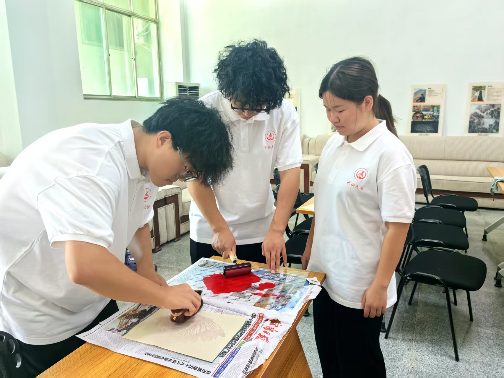 在木版年画拓印体验环节,民间手工艺人何伟伟现场指导团队成员们实践创作。成员们通过精准调控油墨浓稠度、运用墨滚均匀施墨于雕版、定位覆盖宣纸、以棕刷多次拓压等工序,亲手完成多幅版画作品。这一沉浸式体验不仅使成员们切身感受到非遗技艺“毫厘之差,意境迥异”的精妙准则,更在刀笔纵横间深化了对传统手工艺的敬畏与认同。 活动中,团队成员与非遗传承人畅谈交流,共同探讨了新时代背景下非遗与民俗文化的保护、传承和创新发展。