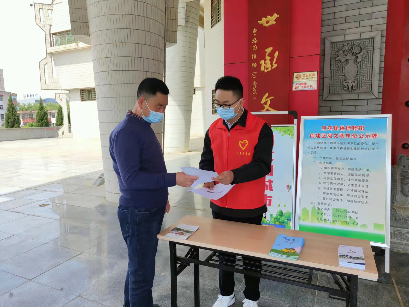 为营造文明和谐、安全有序的旅游环境,进一步提升全市人民的文明旅游意识,5月1日和5月19日,宝鸡民俗博物馆以“五一”劳动节和中国旅游日为契机,开展了以“自觉文明出行,成就最美风景”为主题的志愿宣传活动。