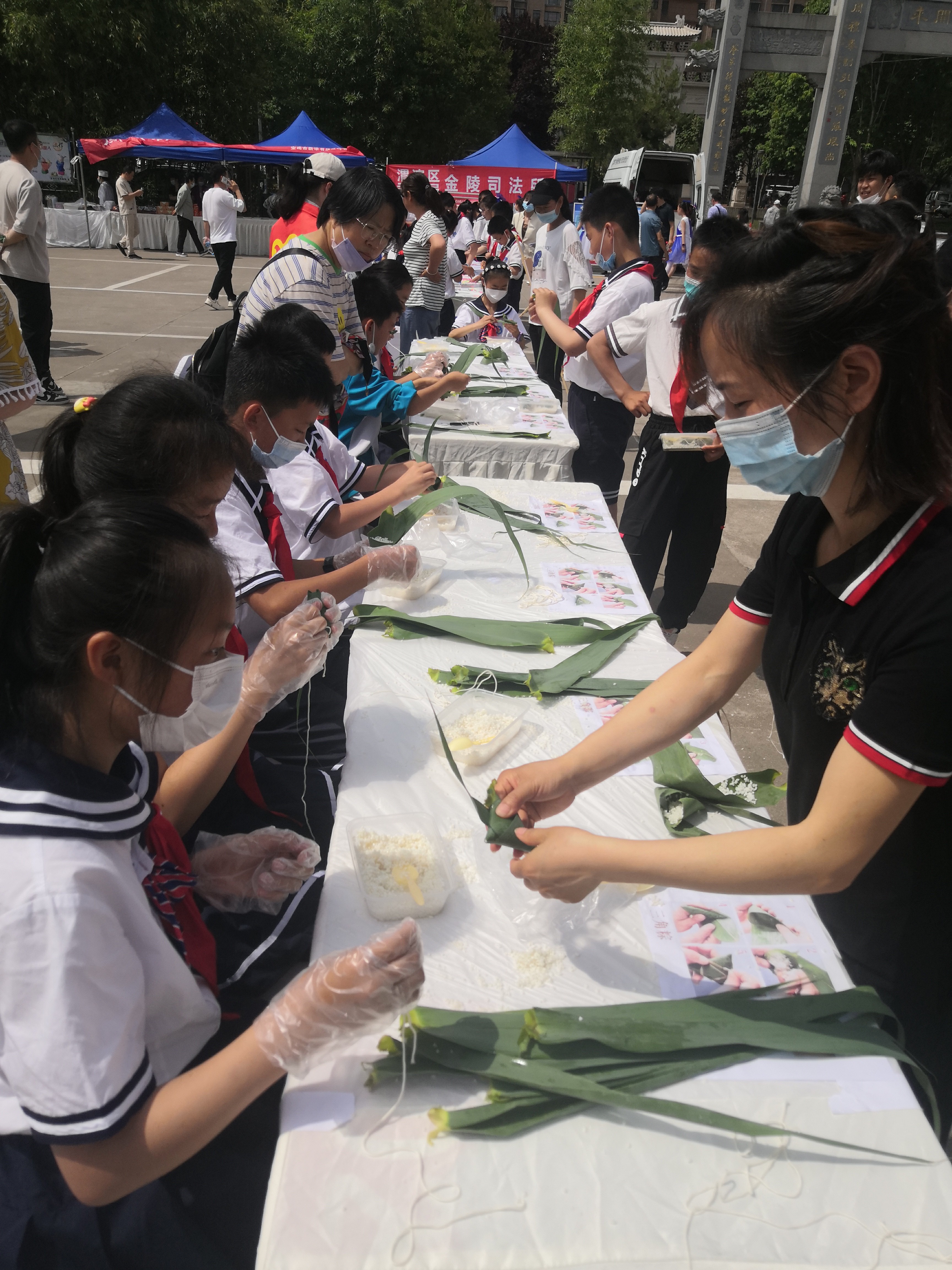 来自航天小学的50余名学生共分六组,参与到包粽子和编花绳比赛中,随着裁判员一声令下,大家纷纷用自己的巧手,卷粽叶、添糯米、编花绳……不一会儿,一个个“清香扑鼻”的粽子就成型了,一条条花绳也在手腕上随风摇曳。随后,对在比赛中表现优秀的同学颁发奖品。