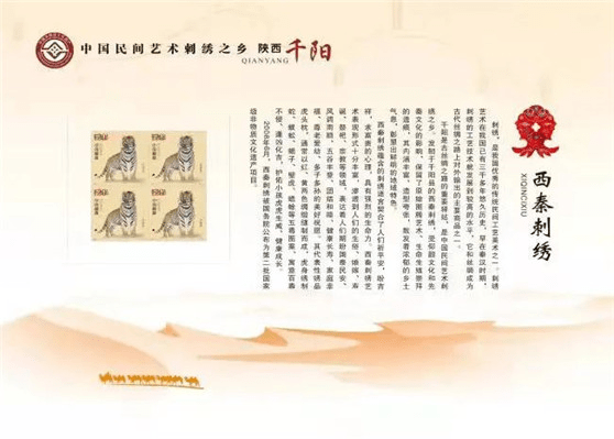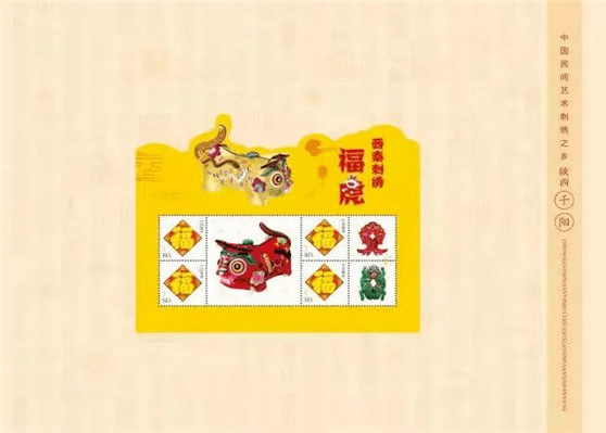 近日,经中国邮政相关部门批准,千阳专属邮票《西秦刺绣——福虎》正式发行。整幅邮票设计以“五福临门”邮票为主图,附图内容为国家级非物质文化遗产项目——西秦刺绣代表性绣品,中间突出表现虎头枕,右侧为五毒鱼耳枕和五毒青蛙耳枕。