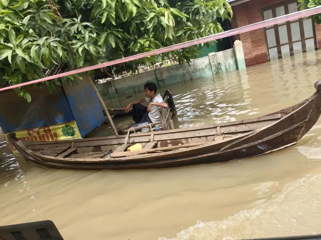 在外出调查、来往的路上,多次路过被水淹没的街道。虽然蒲甘地区最近没有强降雨,偶尔会有小的阵雨,但由于上游的大雨和山区夏季雪水融化,造成了河道水流暴涨,不少街道被淹没。不过,当地人似乎已经习以为常,小孩子就在积水的街道上玩水,大人则撑着船,安坐在水中树荫下的长椅上,看着孩子们悠然自得。蒲甘当地的人大约都是这样,悠闲自然,不紧不慢,享受着大自然的一切馈赠。